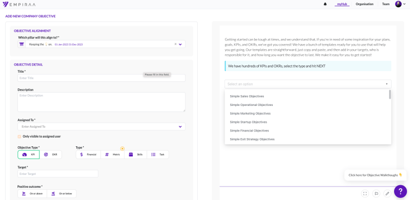 We also know that sometimes writer’s block can kick in, and it can be tough to put your ideas into words. That’s why we’ve introduced our new Objective Templates to help you get started. With over 40 industries and objective types to choose from, you can easily find a KPI or OKR for your business and simply copy and paste it into your plan.